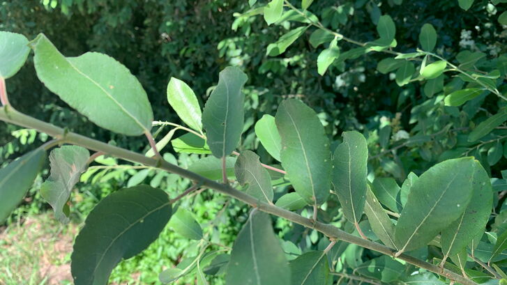 Mäßig verzweigter, kurzstämmiger Baum, Zweige dick, gelbbraun bis braun, kahl, Jungtriebe graugrün, kurz behaart, später kahl.