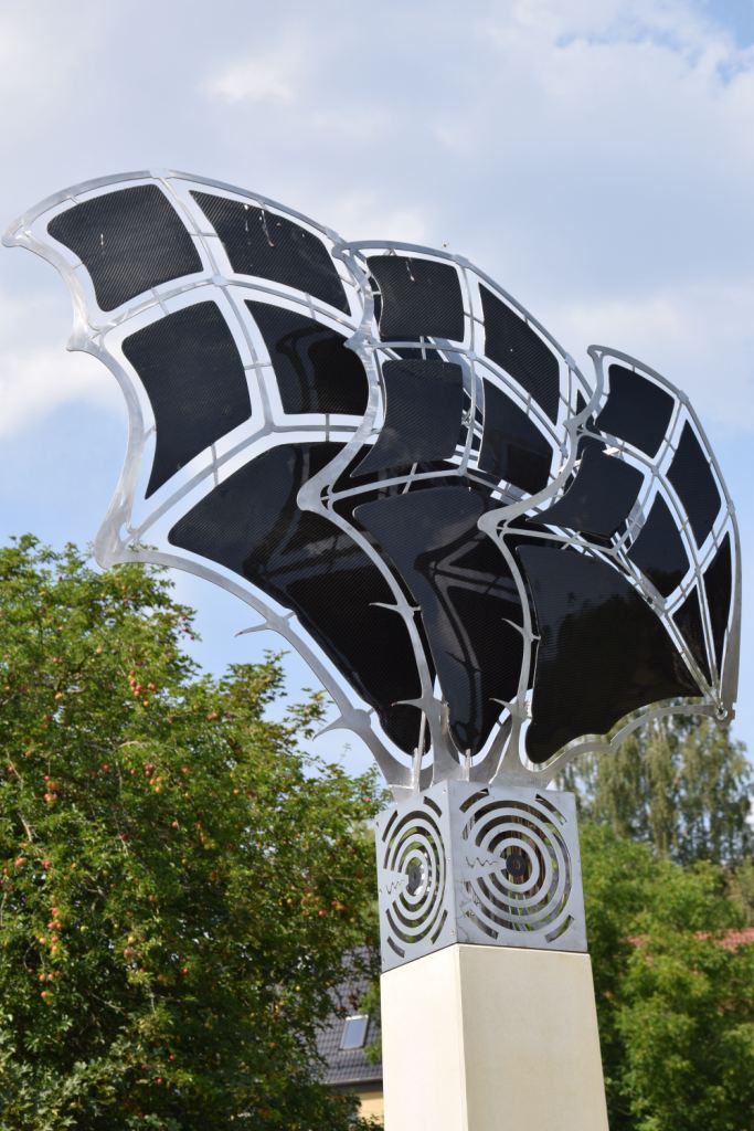 Seit je her hat der Mensch die Natur beobachtet und von ihr gelernt. Die Entschlüsselung der belebten Natur und ihre innovative Umsetzung in der Technik brachte die menschliche Zivilisation enorm voran. Geheimnisvolle Strukturen und hoch entwickelte Systeme verbergen sich in Fauna und Flora. Um die in tausenden von Jahren optimierten Organismen ganz zu verstehen, müssen wir sie erhalten. Die Flügelskulptur wurde inspiriert durch die Flügel der Fledermaus. Die Skulptur besteht aus Karbonfaser und Edelstahl und thematisiert den Erkenntnisgewinn durch die Erforschung der Natur.