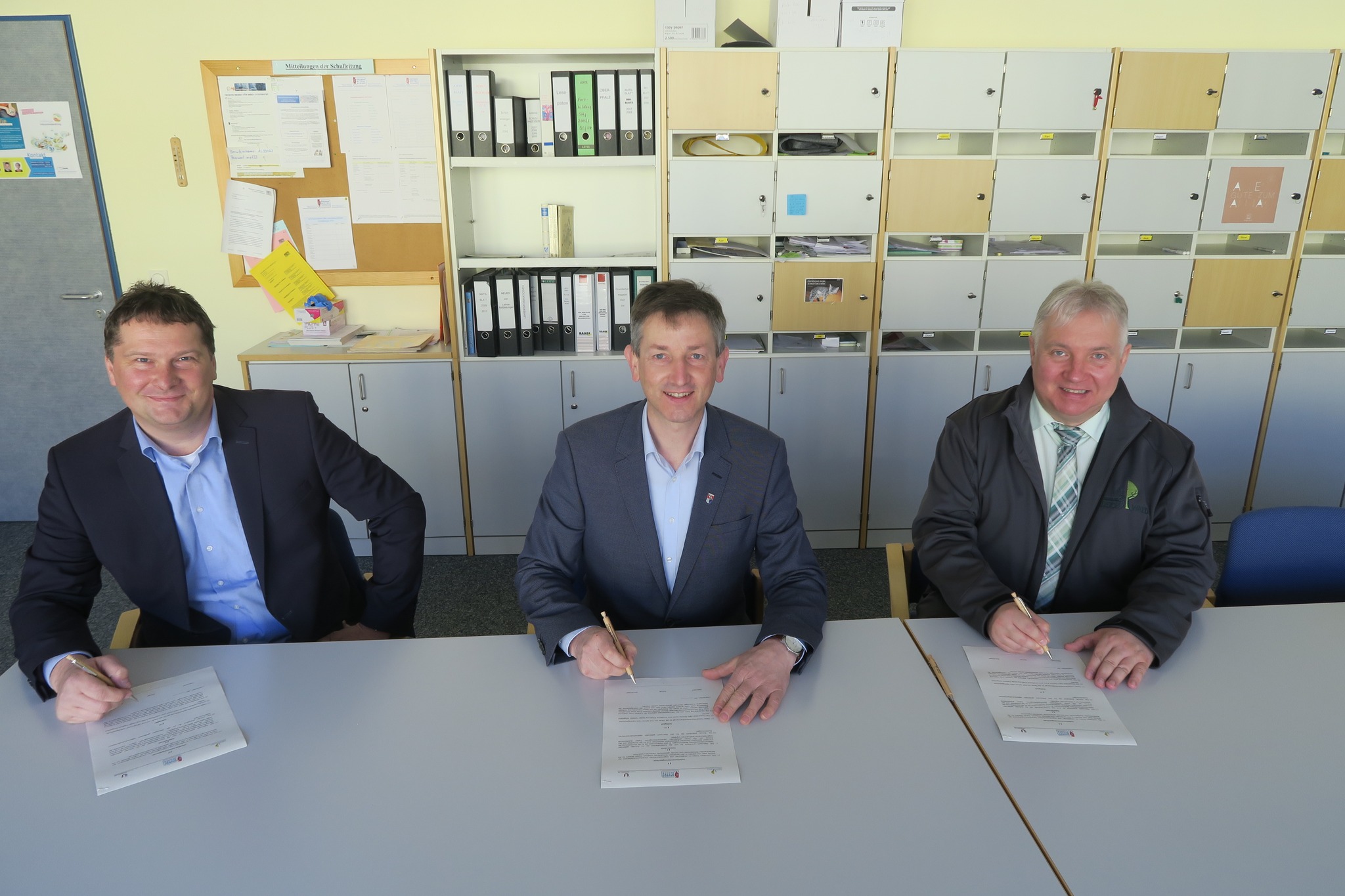 Der Naturpark Hirschwald schloss mit der Grund- und Mittelschule Ursensollen und dem Sachaufwandsträger Gemeinde Ursensollen einen Kooperationsvertrag. Rektor Peter Großmann, Bürgermeister Albert Geitner und Naturpark-Vorsitzender Markus Dollacker freuten sich über die Unterzeichnung des Kooperationsvertrages (v. li.). Damit wird die enge Zusammenarbeit zwischen Naturpark und Schule besiegelt und der Grundstein für die Zertifizierung als Naturpark-Schule durch den Dachverband Verband Deutscher Naturparke (VDN) gelegt. Ziel ist es, dass jedes Kind originäre Natur- und Heimaterfahrungen im Naturpark Hirschwald macht. Der Naturpark unterstützt die Schulfamilie dabei mit den Naturpark-Rangern und weiteren Kooperationspartnern in der Region.
