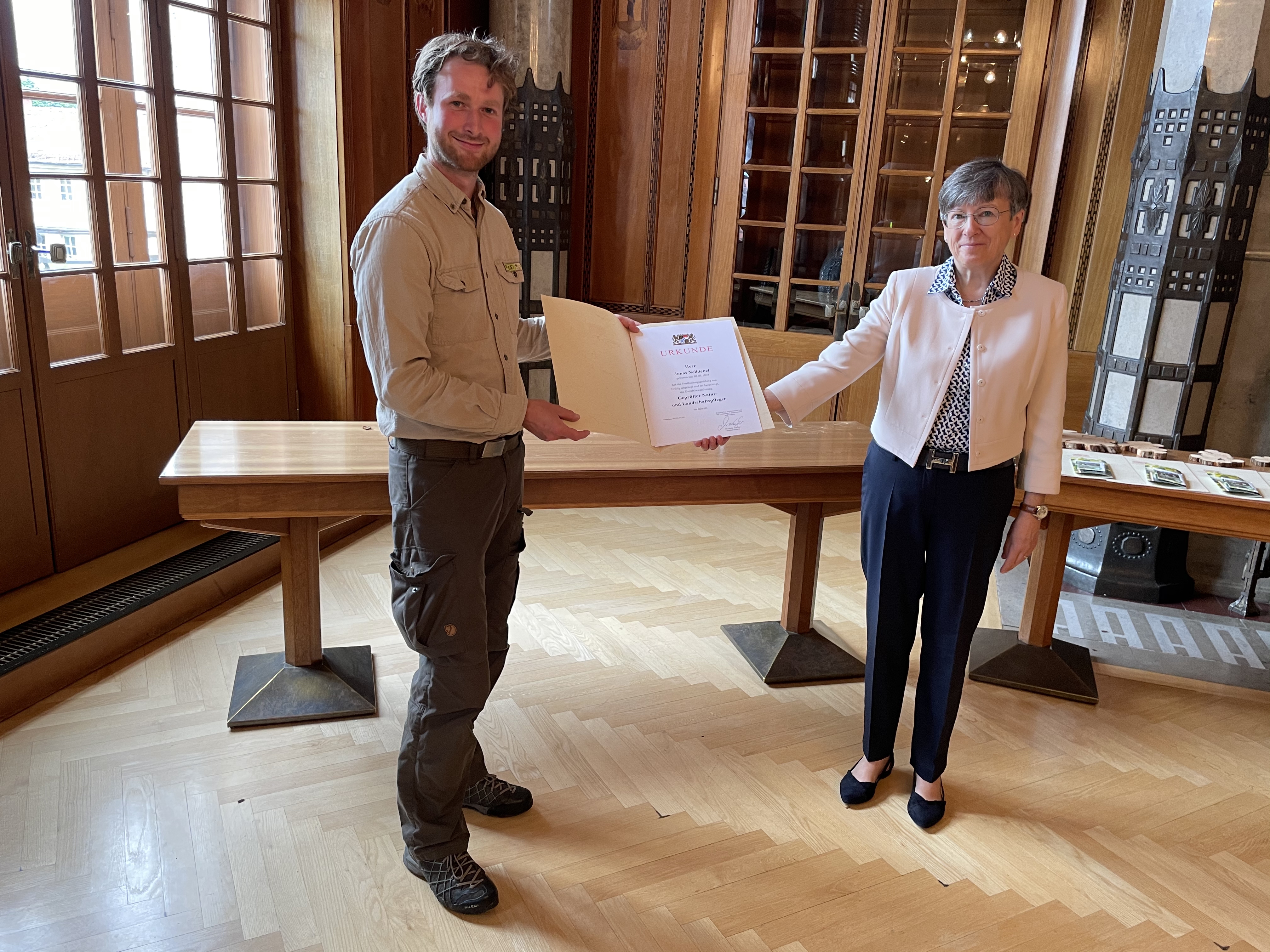 Nach 17 Lehrgangswochen ab September 2020 und anspruchsvollen praktischen und schriftlichen Prüfungen - als zusätzliche Erschwernis unter Corona-Bedingungen - konnte Jonas Nelhiebel, Ranger im Naturpark Hirschwald, die Fortbildung „Geprüfter Natur- und Landschaftspfleger“ erfolgreich abschließen. Feierlich übergeben wurden die Urkunden an ihn und die weiteren TeilnehmerInnen des Kurses durch die Regierungspräsidentin von Oberfranken, Heidrun Piwernetz.